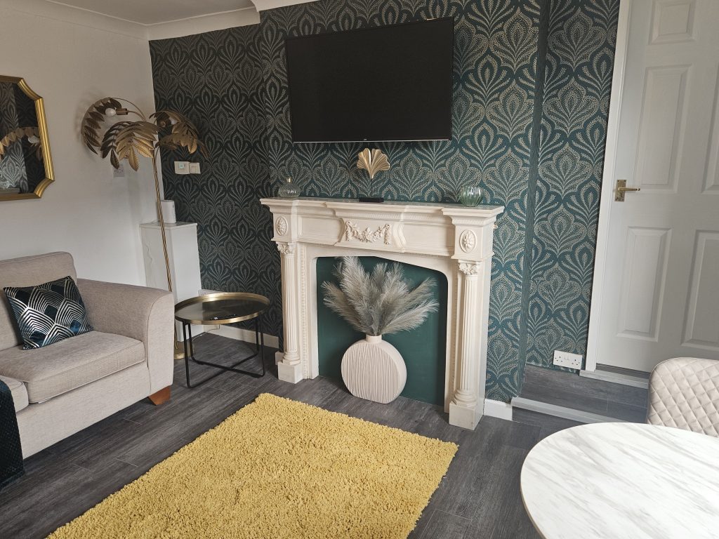 Living room with wall mounted TV & sofa, flowing into the dining area with round marble dining table and chairs.