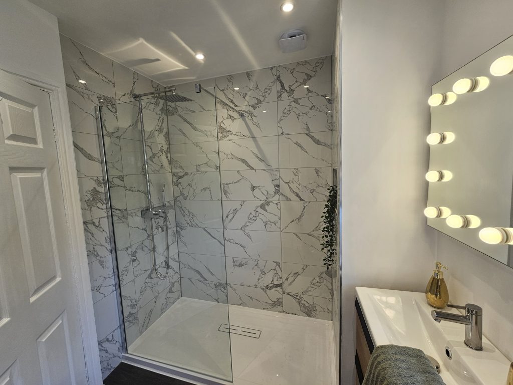 A bright, modern shower room with rainfall shower head, shower hose and glass panel.