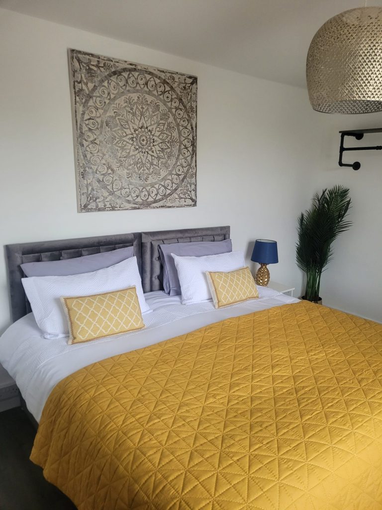 A light, bright large bedroom with king size bed. Quality bedding & mattress will ensure a good nights’ sleep. Plenty of storage with side bed unit, 3 drawer larger unit and hanging space.
